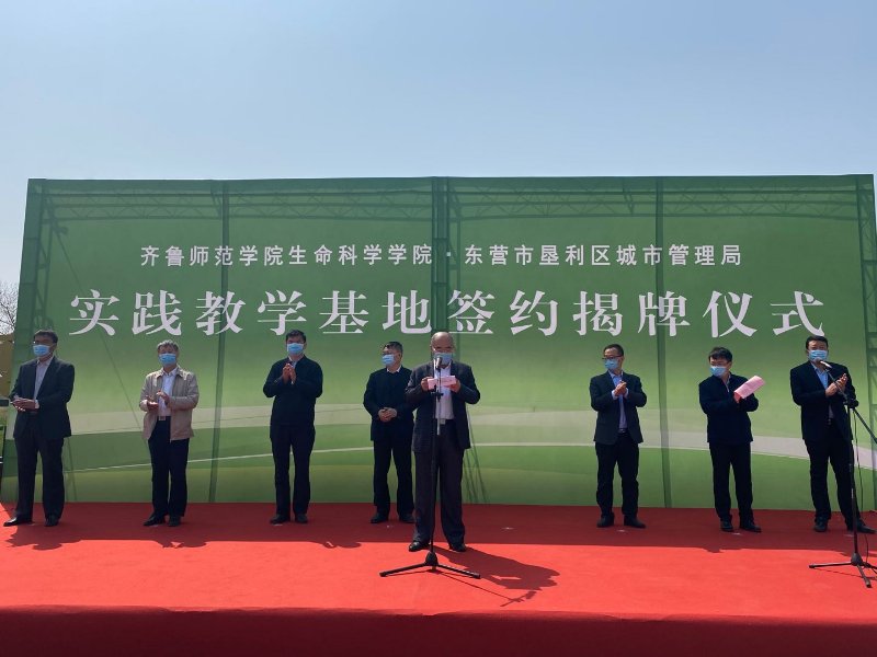 仪式上,宋金生介绍实践教学基地筹建情况。陈步先代表垦利区党委对教学实践基地的揭牌表示祝贺,对省工作组促成垦利区和我校联姻共建表示感谢。他表示,实践教学基地的建立,是垦利区引智借力促进当地经济发展的重要举措,下一步,垦利区将加强与我校联系,加大合作广度和深度,为区经济社会发展注入新的活力。李启波代表学校对垦利区委、区政府在疫情防控和经济社会发展中取得的重大成效表示祝贺。而后介绍了我校基本情况以及生命科学学院近几年在学科专业建设和人才团队发展方面取得的成就。他表示,本次校地合作共建实践教学基地是我校和垦利区委政府深入学习贯彻习近平总书记重要讲话精神、重要指示精神,落实中央和省委重大部署的重要举措,是齐鲁师范学院与垦利区携手并进、共谋发展的重要机遇。今后,两单位要借助这一平台,加强沟通交流,不断深化合作,使友谊之树不断结出丰硕成果,更好地造福社会。