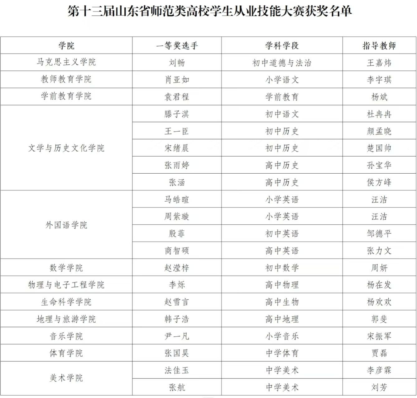由山东省教育厅主办、齐鲁师范学院承办的第十三届山东省师范类高校学生从业技能大赛于7月20日圆满落幕。经过激烈角逐,师院参赛学子表现卓越,65名参加决赛的选手共斩获一等奖20项、二等奖20项、三等奖19项,19名教师获“优秀辅导教师”称号,一等奖获奖总数位居全省高校第三位,获奖总人数位居全省高校第二位。同时,学校力摘团体银奖及优秀组织奖,获奖情况实现历史性突破!