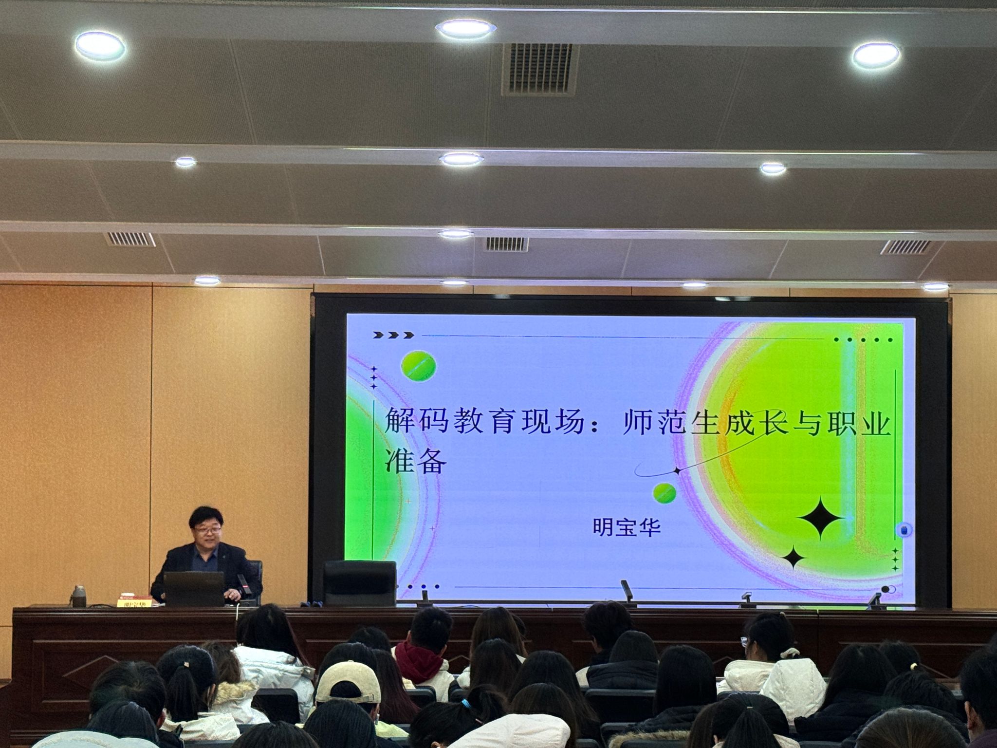 明宝华以“我的教育之路”为叙事主线,深情回顾了其教育生涯中三次意义深远的转折。从初为人师时在首次班主任经验交流会上获得的认可,到教育部挂职期间“视界决定世界”的格局提升,再到最终凝练出“让教师站在学校中央,让学生站在课堂中央”这一鲜明的教育理念,他娓娓道来的个人史,恰是一幅当代教师专业成长的生动缩影。他强调,职业发展离不开适宜的“土壤”——平台不仅奠定能力根基、积累关键资源,更深层地塑造着教师的思维模式与认知边界。他勉励在场学子,要主动审视并勇敢融入能激发潜能、拓宽视野的成长平台,为自己的教育人生奠定坚实基础。