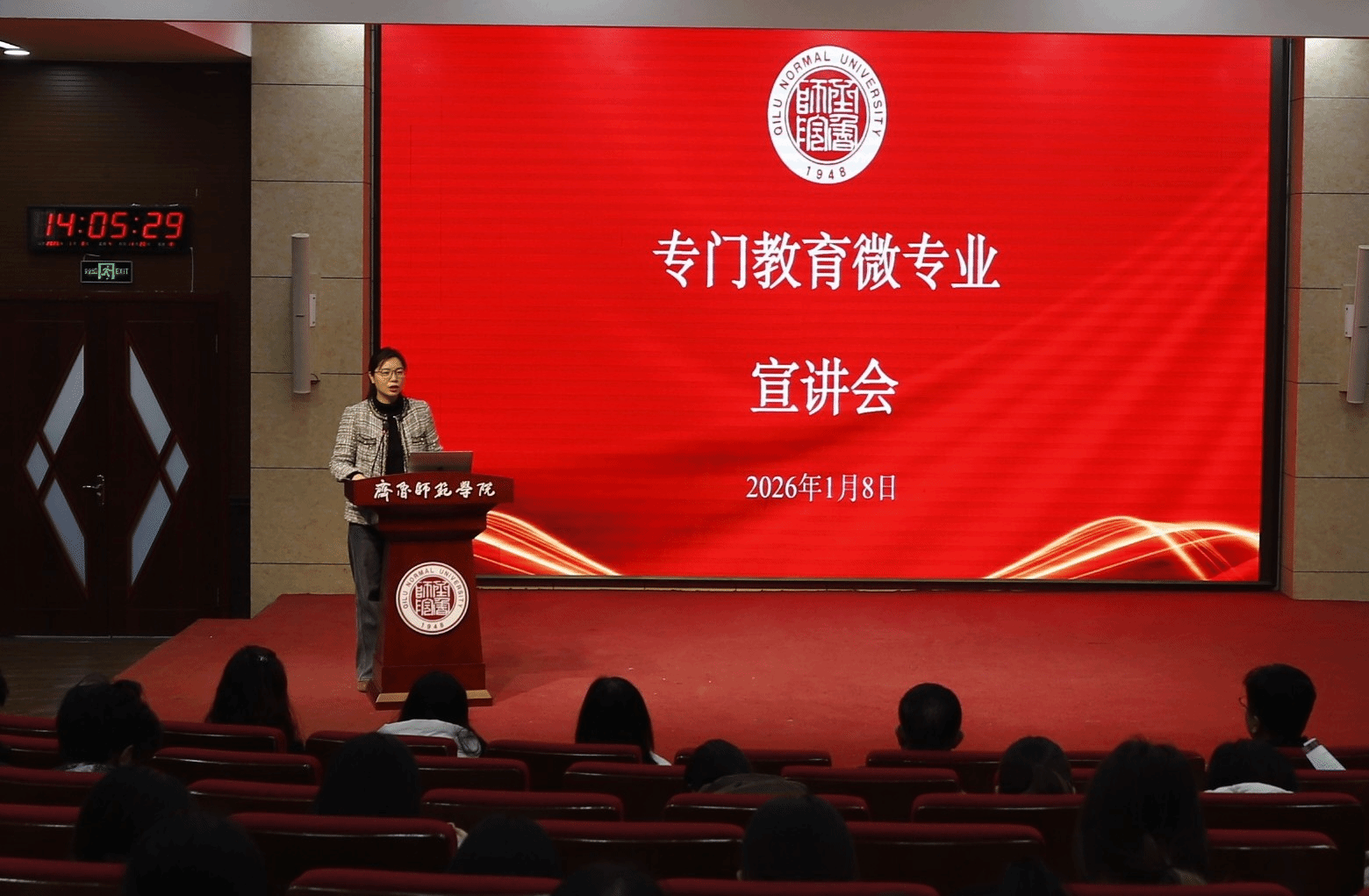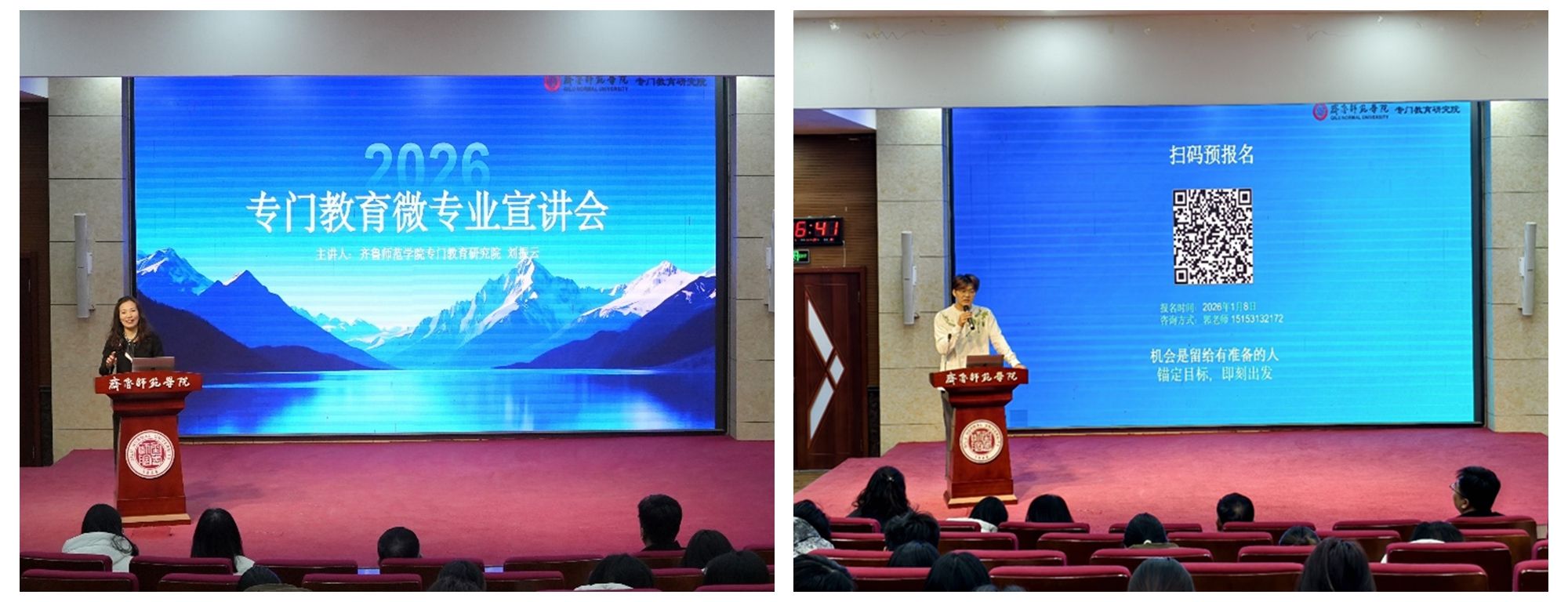 为深入贯彻落实学校微专业建设规划,推动复合型人才培养,1月8日,由教务处组织的2026年度微专业招生宣讲系列活动正式启动。首场活动联合齐鲁师范学院专门教育研究院开展,聚焦“专门教育微专业”,致力于帮助学生深入了解该微专业政策、课程设置与发展前景。宣讲活动在章丘校区第一学术报告厅举行,吸引了来自教师教育学院等7个学院的近300名学生积极参与。人事处处长、专门教育研究院副院长刘增军,人事处副处长、专门教育研究院秘书长李华,以及“专门教育”微专业负责人、教师教育学院刘桂荣教授出席活动。活动由教务处副处长田甜主持。