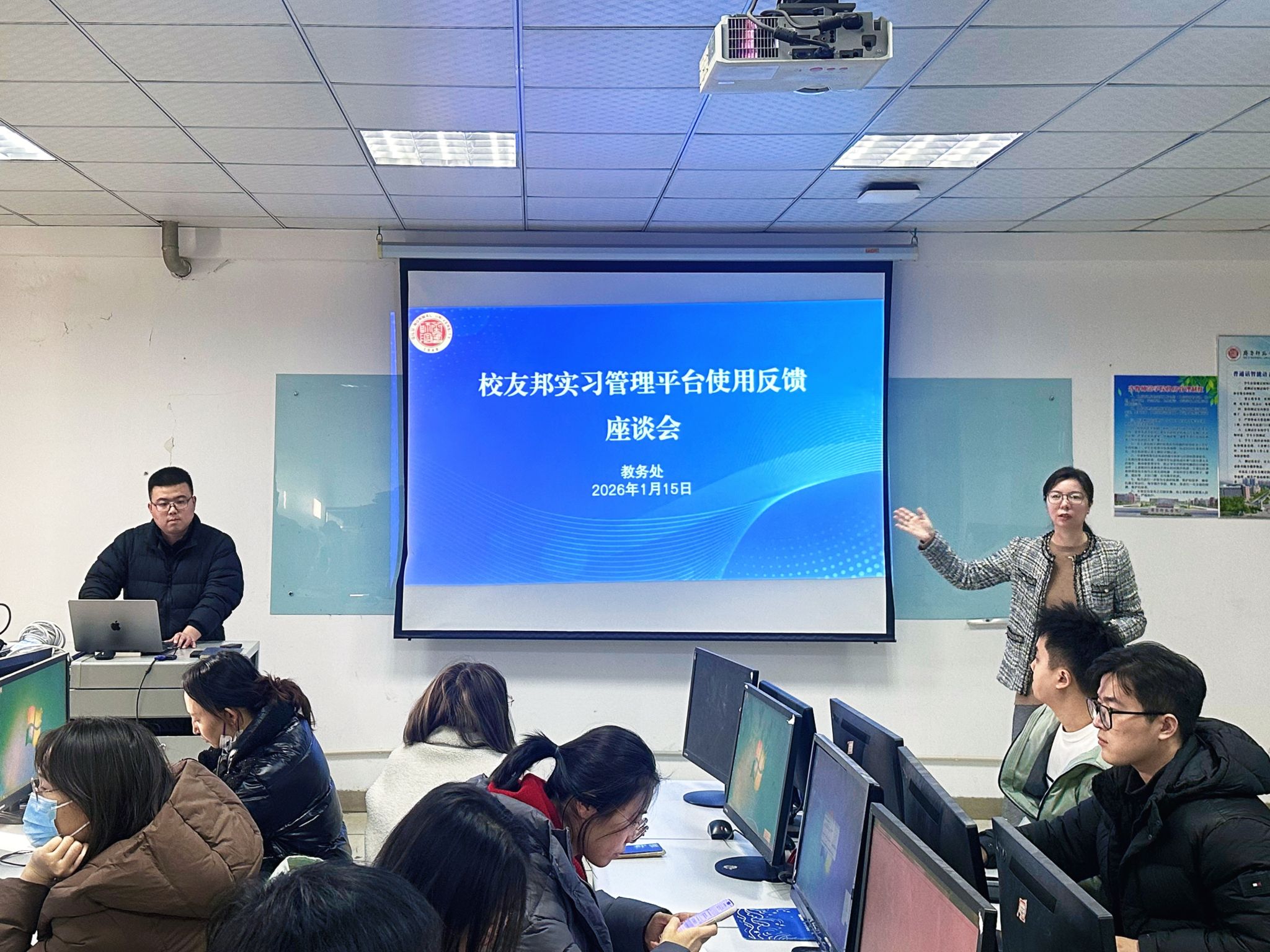 为提升实习管理信息化水平,进一步推动我校实习教学过程规范化,2026年1月15日下午,教务处在二号教学楼A510机房召开校友邦实习管理平台使用反馈座谈会。会议由教务处副处长田甜主持。