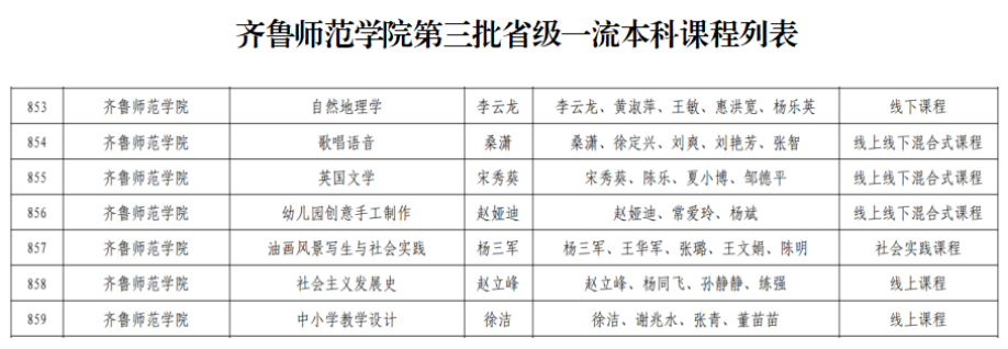 近日,山东省教育厅公布了第三批省级一流本科课程认定结果,齐鲁师范学院7门课程被认定为省级一流本科课程,其中线下课程1门、线上线下混合式课程3门、社会实践课程1门、线上课程2门。截至目前,学校共获批省级一流本科课程18门。