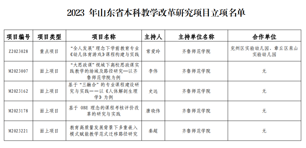 近日,山东省教育厅公布了2023 年山东省本科教学改革研究项目立项名单、2023 年山东省职业教育教学改革研究项目立项名单。齐鲁师范学院获批5项山东省本科教学改革研究项目和2项山东省职业教育教学改革研究项目。