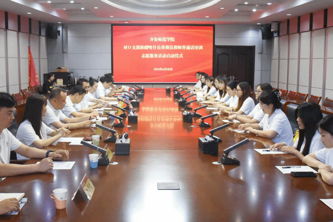 为认真贯彻落实第三次中央新疆工作座谈会、第九次全国对口支援新疆工作会议精神,持续深化教育援疆,铸牢中华民族共同体意识,6月28日,齐鲁师范学院举行“对口支援新疆喀什岳普湖县教师普通话培训”志愿服务活动启动仪式。党委委员、副校长、国家语言文字推广基地(齐鲁师范学院)主任孙正出席启动仪式并讲话。启动仪式由教务处考试中心主任牛忠良主持。