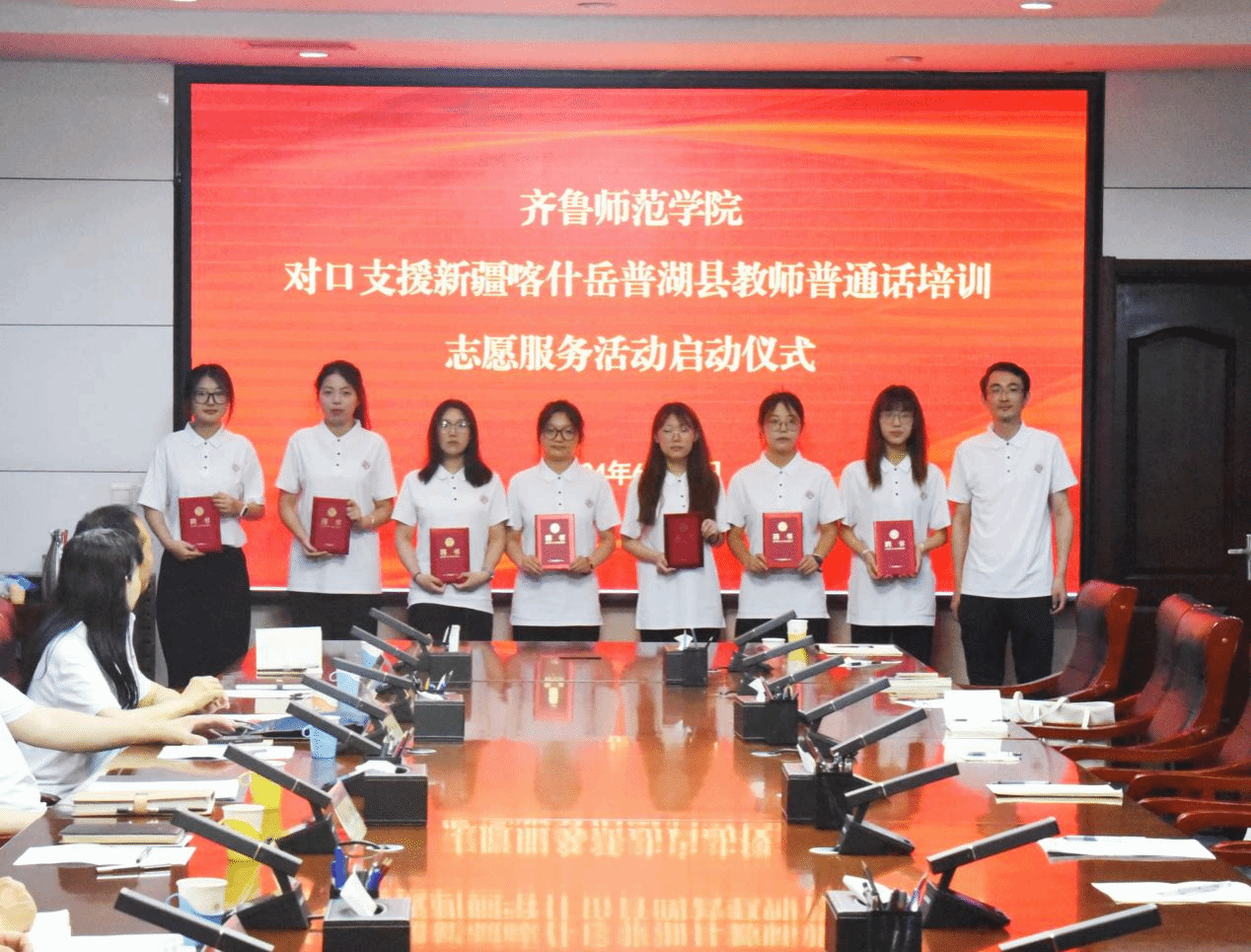 教务处、国家语言文字推广基地(齐鲁师范学院)办公室相关人员,齐鲁师范学院“援喀什岳普湖普通话培训”志愿服务队全体成员参加启动仪式。