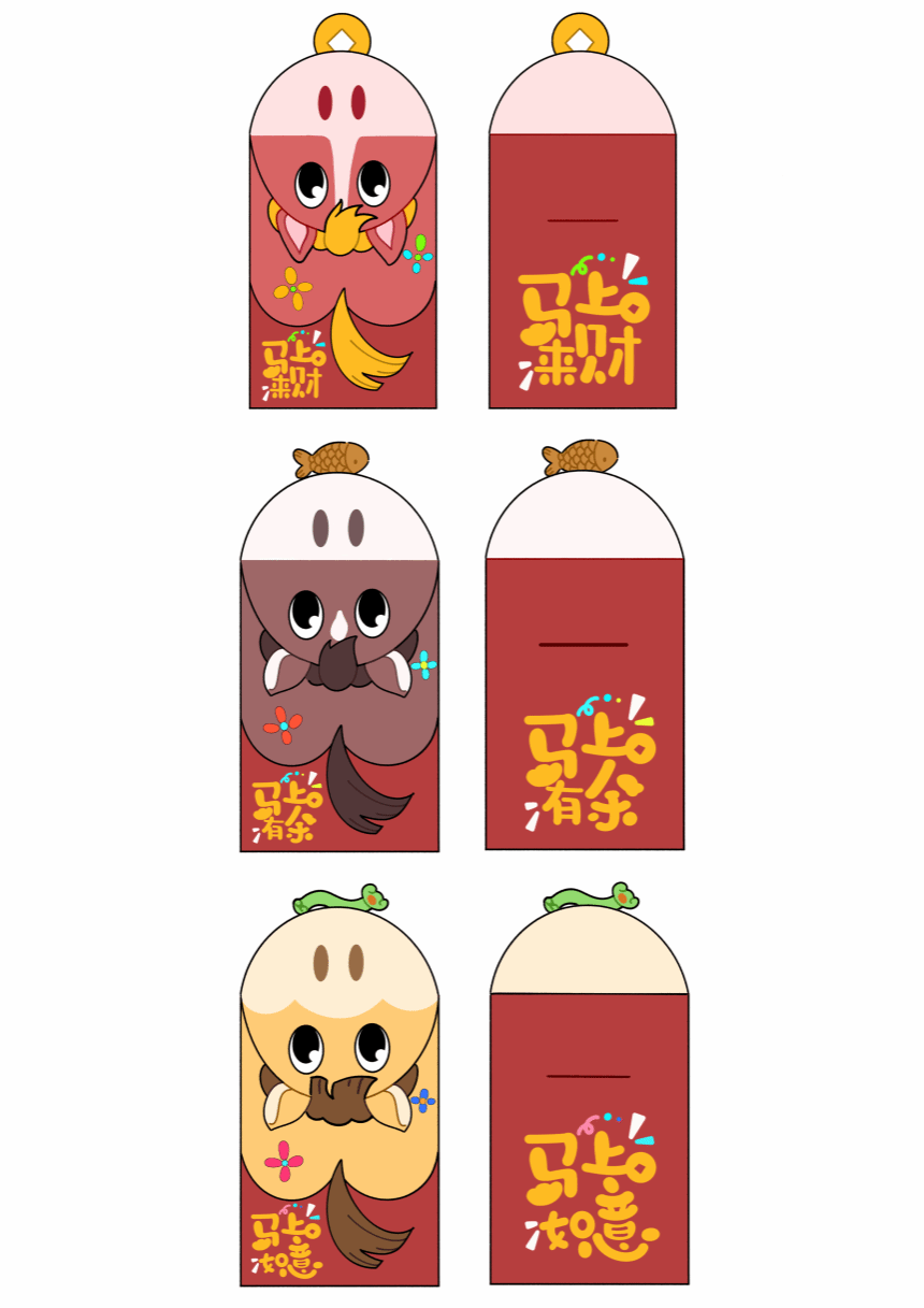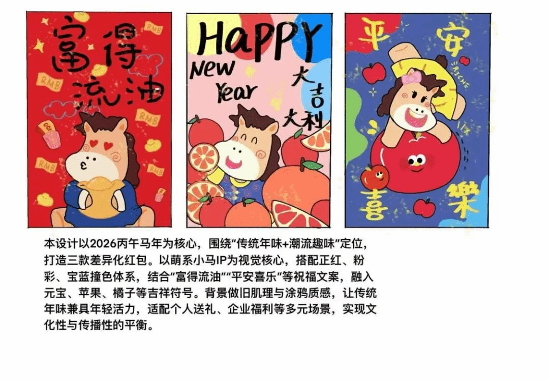 2024级包装设计一班李瑜瑶以马年生肖为核心设计红包文创,融合“马上发财”“马上封侯”“马上平安”三大吉祥谐音梗,用Q萌卡通马形象结合传统喜庆配色,传递马年专属祝福。整体风格兼顾传统年味与年轻群体偏好的萌系审美,适配多元社交与馈赠场景。