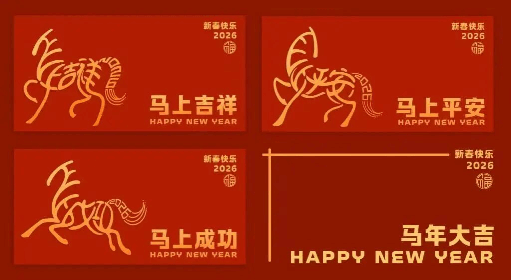 2024级包装设计一班贾欣然以马的动态简约线条为核心视觉设计红包文创,将“马上成功”“马上吉祥”“马上平安”吉祥语融入线条造型,尾巴结合2026年份数字与灯笼穗线条,主色调采用红黄色系,紧扣马年新年主题。