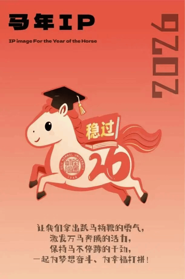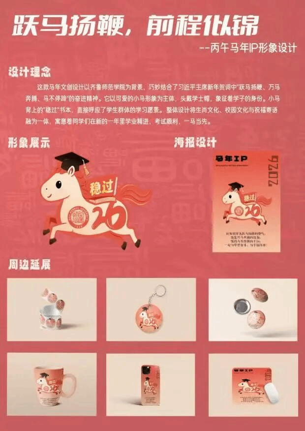 2024级视觉传达设计四班赵心雨以齐鲁师范学院为背景,巧妙结合习近平总书记新年贺词中“跃马扬鞭、万马奔腾、马不停蹄”的奋进精神,设计了这款马年文创作品。它以小马形象为主体,头戴学士帽,象征着学子身份。小马背上的“稳过”书本,直接呼应了学生的学习愿景。整体设计将生肖文化、校园文化与祝福寄语融为一体,寓意着同学们在新的一年里学业精进,考试顺利,一马当先。