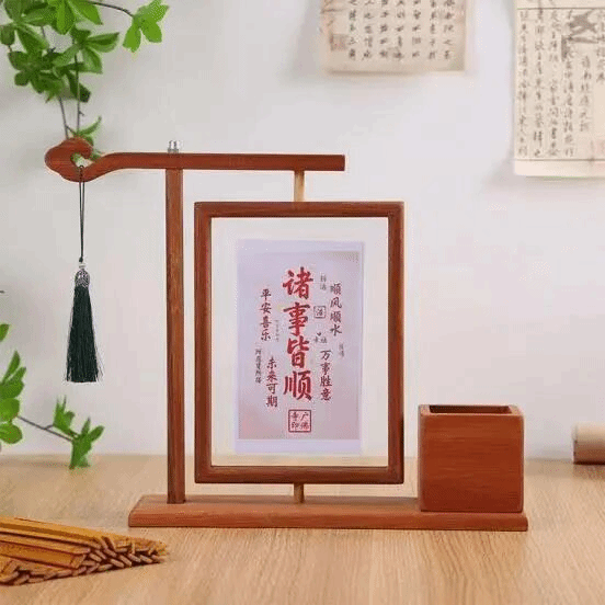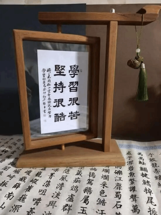 2025级美术学国画班郜若冰将中式美学与当代实用结合,选用原木作为主体材质,保留木材的温润质感,搭配榫卯式的支架结构,是对中式传统家具工艺的致敬。上方的挂架既可悬挂流苏挂饰增添雅致感,又能稳定支撑相框,让它既是一件实用的展示工具,也是一件有东方韵味的桌面摆件。把“自我提醒”转化为具有仪式感的物件,在传递正能量的同时,也提升了桌面的文化氛围。