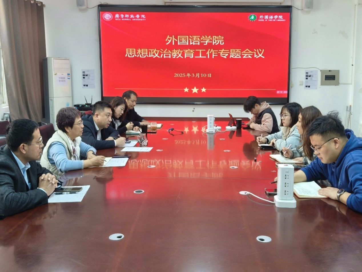 为深入学习贯彻习近平新时代中国特色社会主义思想和党的二十大、二十届三中全会精神,全面贯彻党的教育方针,巩固深化思政教育成果,外国语学院党委于3月10日上午召开思想政治教育工作专题会议。学院党政班子成员和全体辅导员参加会议。会议由学院党委书记于江主持。