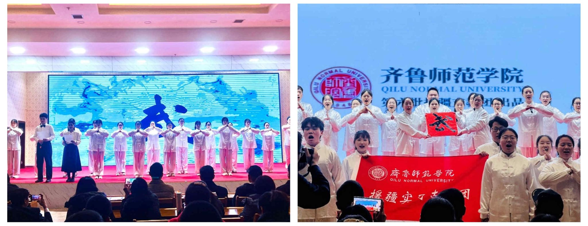 齐鲁师范学院第六批援疆实习支教团全体成员在领队赵青与带队老师汪洁的带领下,积极参与此次联欢活动,并以武术节目《中华武韵·齐鲁英姿》惊艳全场。该节目融合了学校特色武术文化与外国语学院专业特色,生动展现了中华武术的博大精深与齐鲁文化的独特魅力。经过支教团成员们的精心策划与辛苦排练,他们以矫健的身手、默契的配合及流畅的中英文解说,将《中华武韵·齐鲁英姿》演绎得精彩绝伦,不仅彰显了学校武术文化的传承与发展,展示了援疆支教团师生良好的精神风貌,更赢得了现场观众的阵阵掌声与高度赞誉。
