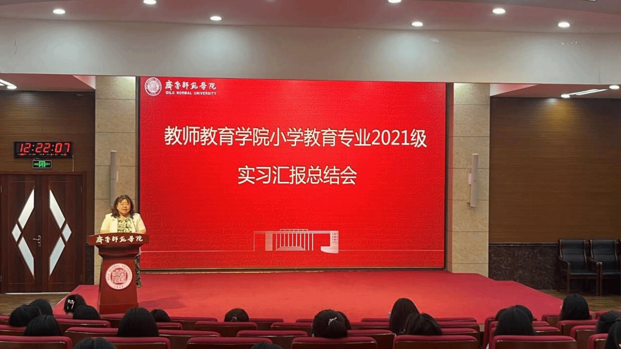 7月11日上午,教师教育学院小学教育专业在章丘校区第一学术报告厅召开了2021级实习汇报总结会。学院副院长李爽、小学教育专业负责人滕秀芹、科学教育专业负责人王岩、小学教育专业教研室主任王蕾、办公室主任刘大凯、团总支副书记王亚东,小学教育专业部分教师及2021级全体学生参加会议。