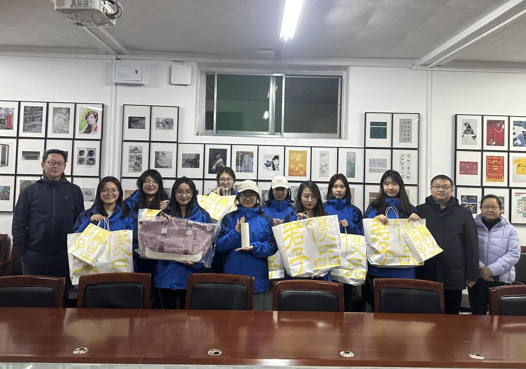 会后,与会领导、教师与支教团学生在教学楼前合影留念,并赠送美术学院爱心礼包“君子文化”文创产品。