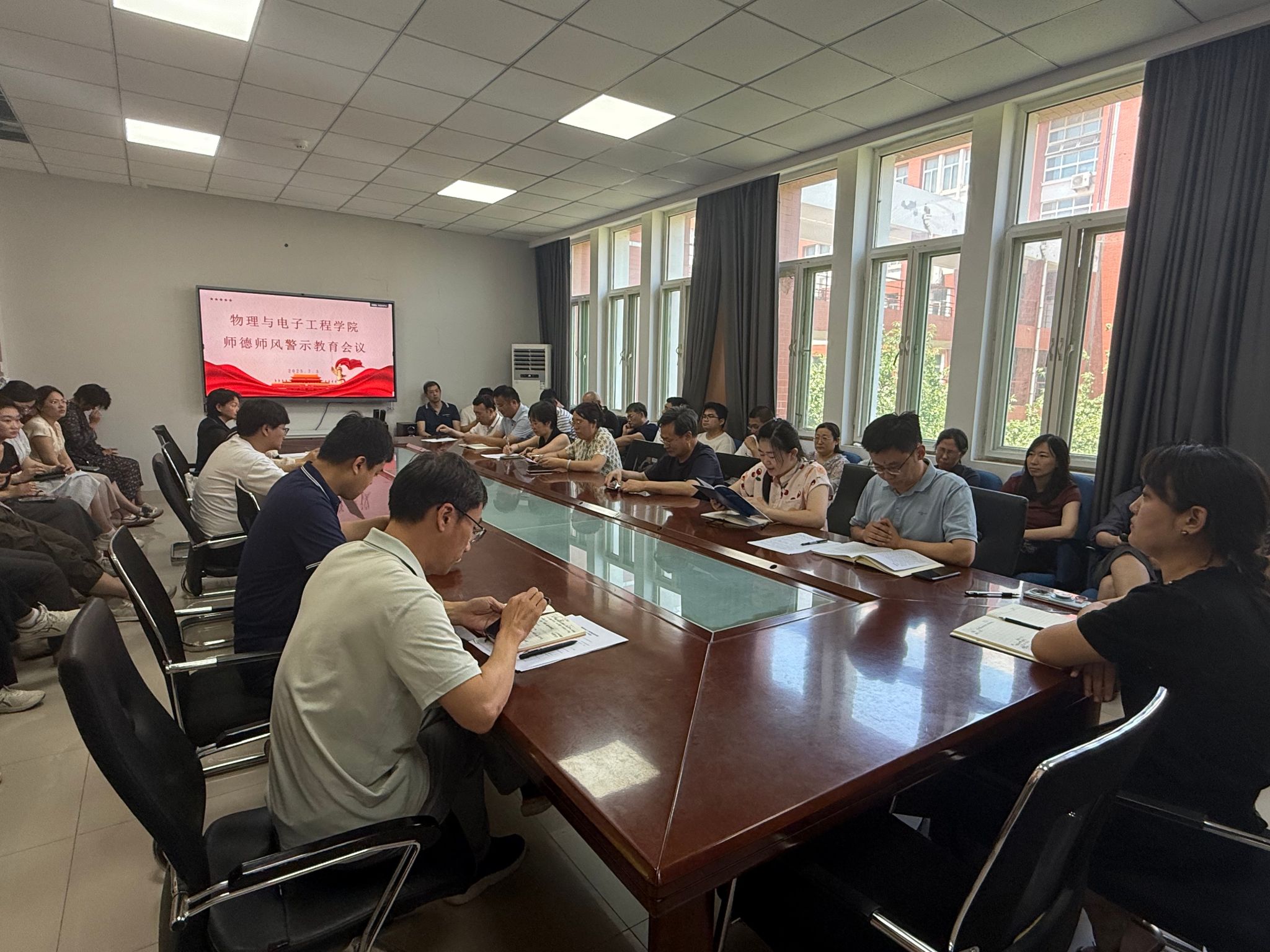 为扎实推进深入贯彻中央八项规定精神学习教育,进一步加强学院师德师风建设,切实筑牢教师队伍廉洁从教防线,7月3日,物理与电子工程学院于学院会议室组织开展师德师风警示教育会议。学院领导班子成员、全体教师参加会议,会议由学院党委书记臧葳主持。