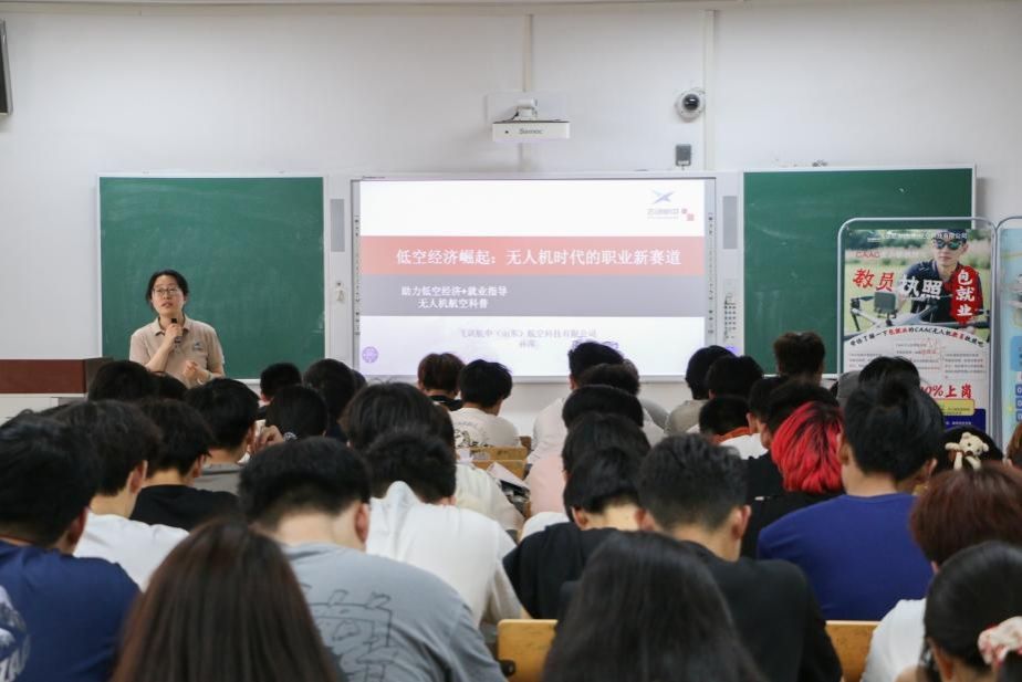 讲座中,孙萍凭借丰富的行业经验和专业知识,首先深入剖析了低空经济的内涵,解读低空经济作为国家战略性新兴产业的核心地位,强调其在优化空域资源配置、推动产业升级中的重要作用以及在当下及未来的重要价值。通过列举济南平阴县低空经济特许经营权成功出让、武汉开通无人机物流航线等案例,让同学们切实感受到低空经济发展的强劲势头。同时,她还对无人机的应用领域进行了全方位介绍,涵盖影视航拍、农林植保、物流配送、警用安防等多个行业,全面展示了无人机在不同场景下发挥的关键作用。最后,针对无人机行业的职业机遇,她深入分析了人才需求现状,指出当前无人机操控及维护人员等相关专业人才严重短缺,就业前景极为广阔,并为同学们提供了详细的职业发展路径指导。