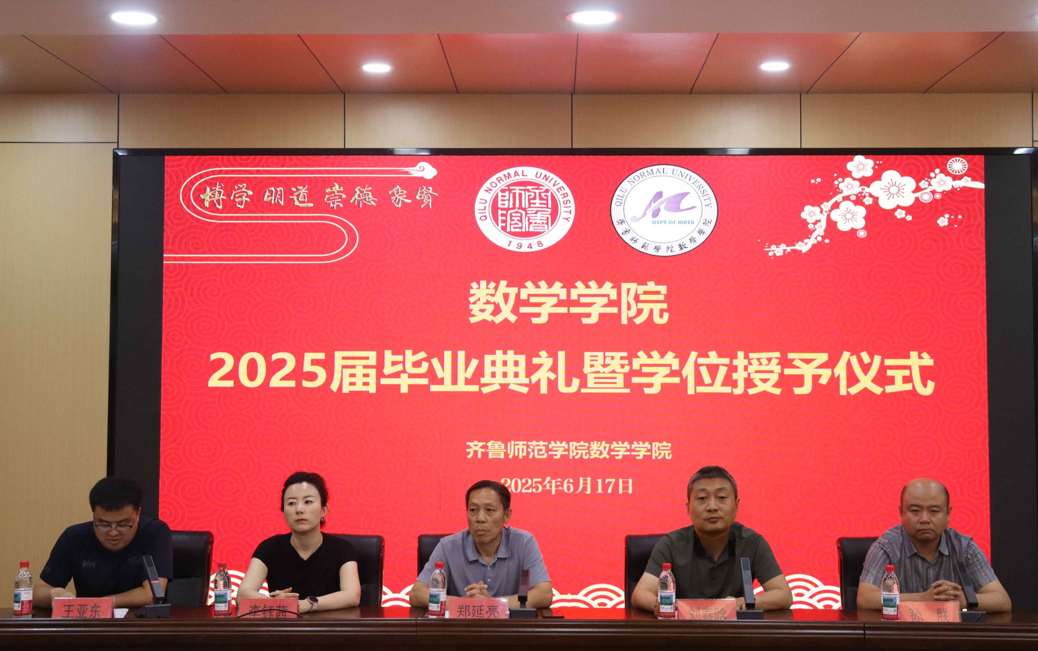6月17日下午,数学学院2025届学生毕业典礼暨学士学位授予仪式在第二学术报告厅举行。学院党委书记郑延亮,学位评定分委员会主任、副院长刘春晗、孙朕,党委副书记李钰茜,学位评定分委员会全体委员,网易有道学业就业规划师王绍敏,毕业班辅导员及全体毕业生参加此次典礼。典礼由数学学院团总支书记王亚东主持。
